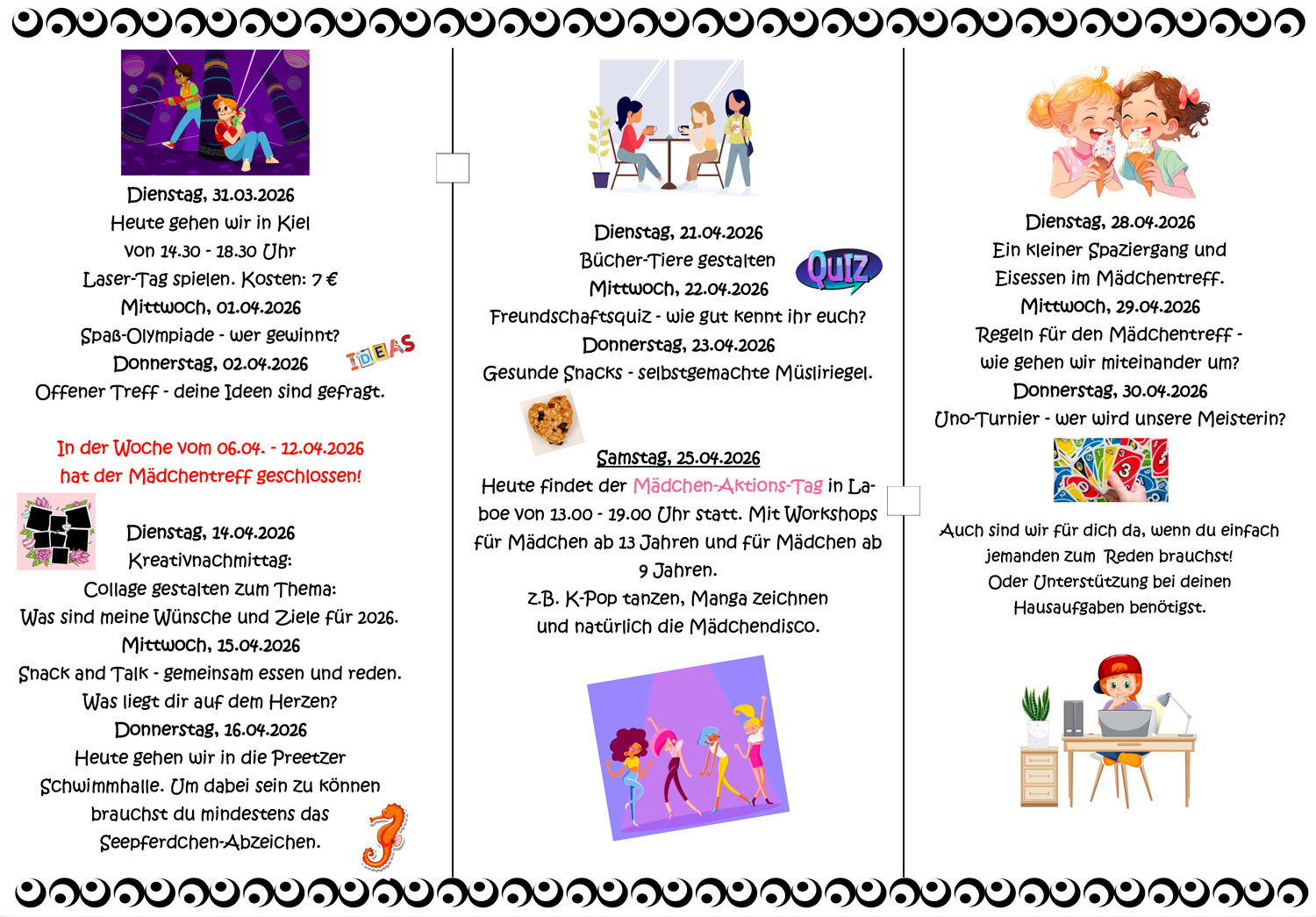 Kommt einfach während unserer Öffnungszeiten unangemeldet vorbei und macht euch ein Bild von uns. Neben vielen spannenden Aktivitäten könnt ihr auch einfach vorbeischauen, um euch mit euren Freundinnen zu treffen und zu entspannen. Wir stehen euch natürlich auch bei Fragen, egal zu welchen Themen, zur Seite. Wenn ihr mal Hilfe braucht, sprecht uns einfach an, wir sind für euch da! Unser Programm wird mehrmals im Jahr veröffentlicht, sodass ihr immer seht, was so als nächstes ansteht und gerne dürft ihr auch eure eigenen Ideen mit einbringen!